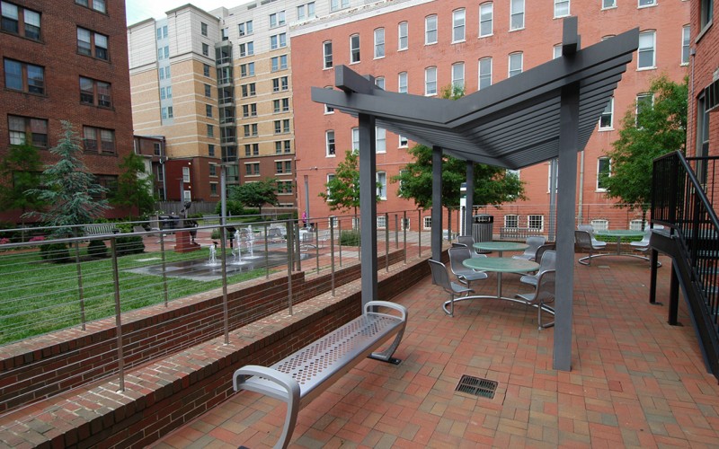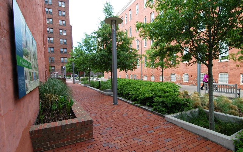 The Square 80 Plaza at The George Washington (GW) University replaces an existing parking lot and service alleys with an urban plaza, expansive lawn, ornamental tree grove, extensive pedestrian network, and an outdoor classroom for GW’s new Sustainable Landscape program. Using multiple low-impact development (LID) techniques, the project targeted 100 percent of all stormwater runoff to be retained on site. Sustainable project elements include: biofiltration planters, native plant material, pervious pavers, and cisterns and rain barrels to capture overflow water and roof runoff for irrigation purposes and for use in the sculptural water feature. Finally, the design includes the use of a rain garden and bioswale filtration in between the two residence halls.